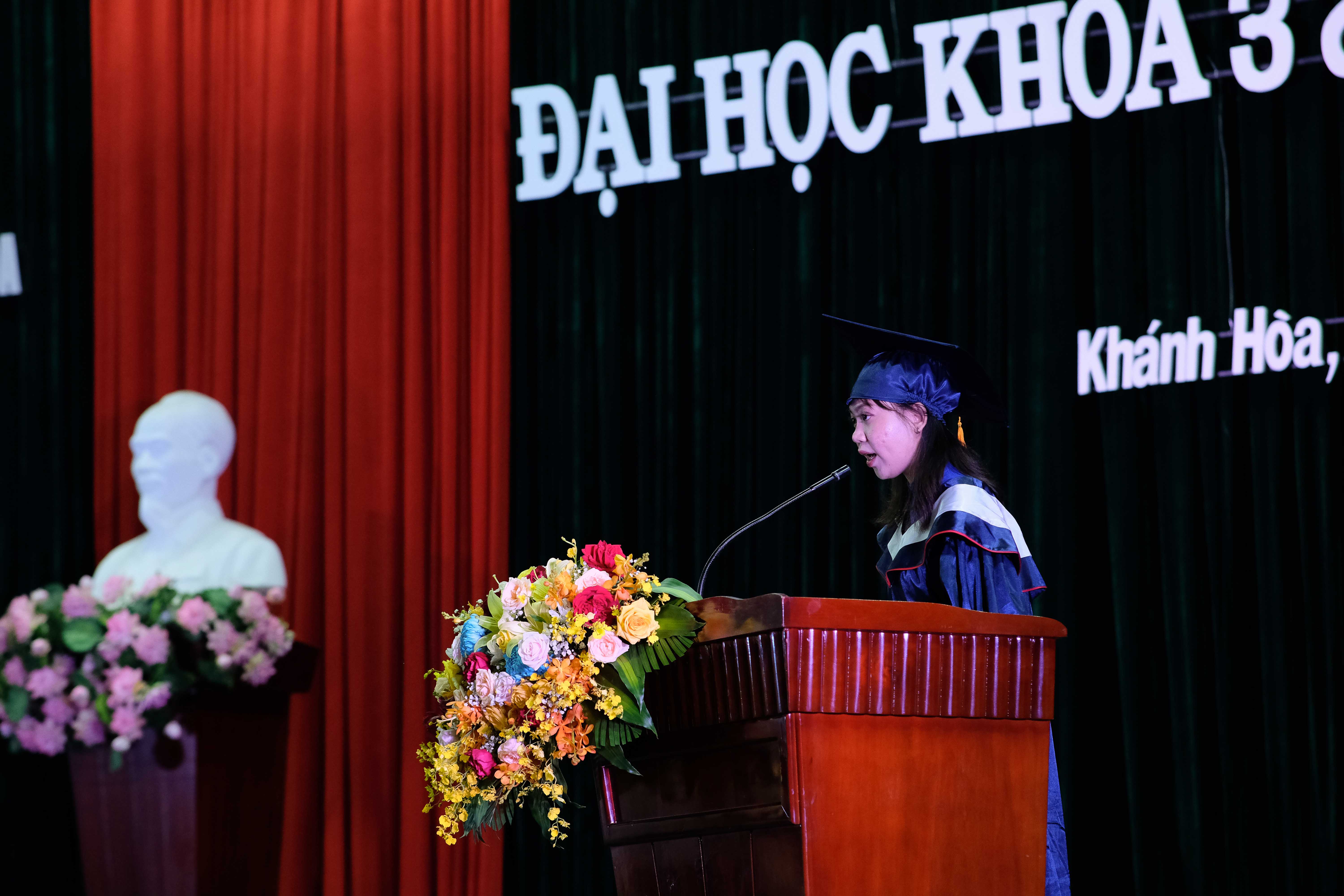 Để thể hiện tình cảm với nhà trường và quý Thầy, Cô giáo trong ngày tốt nghiệp ra trường, xa mái trường thân yêu, sinh viên Lê Thị Bích Việt - tân cử nhân ngành Quản trị Dịch vụ Du lịch và Lữ hành K3E - khoa Du lịch, đã đại diện cho toàn thể sinh viên tốt nghiệp phát biểu cảm tưởng, bày tỏ lòng biết ơn sâu sắc đến Lãnh đạo Trường, quý Thầy, Cô giáo Trường Đại học Khánh Hòa đã tạo mọi điều kiện tốt nhất để chúng em hoàn thành khóa học, chúc nhà trường luôn phát triển bền vững.