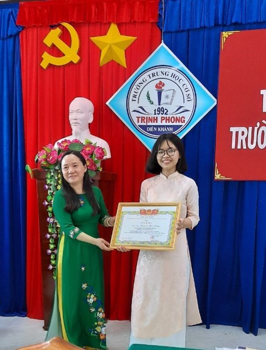 Cũng trong buổi tổng kết này, đại diện Ban chỉ đạo thực tập sư phạm trường THCS Trịnh Phong – Bà Nguyễn Thị Hiền Lê – Hiệu trưởng nhà trường đã tặng giấy khen cho sinh viên có thành tích xuất sắc trong đợt thực tập sư phạm là sinh viên Phan Vi Thảo Sương – Lớp Sư phạm Tiếng Anh – Khóa 43 trường Đại học Khánh Hòa.