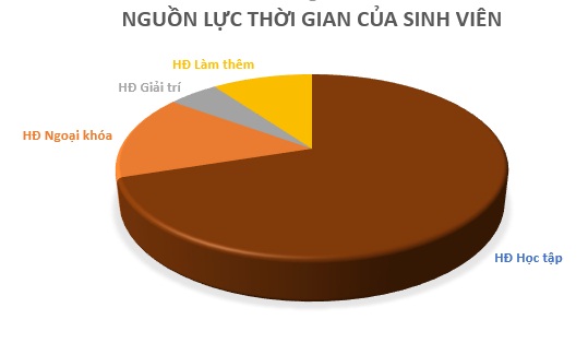 Tóm lại, sinh viên cần dựa vào mục tiêu bản thân và tầm quan trọng của các hoạt động mà phân bổ thời gian cho hợp lí trong đó hoạt động học tập chiếm thời lượng ưu tiên và diễn ra đều đặn giữa các ngày trong tuần. Các hoạt động khác cần phân bổ thời gian cho phù hợp, xen kẽ giữa các ngày trong tuần. Có thể minh họa sự phân bổ nguồn lực thời gian của sinh viên bằng biểu đồ sau, trong đó thứ tự ưu tiên dành cho phần màu đậm hơn:
