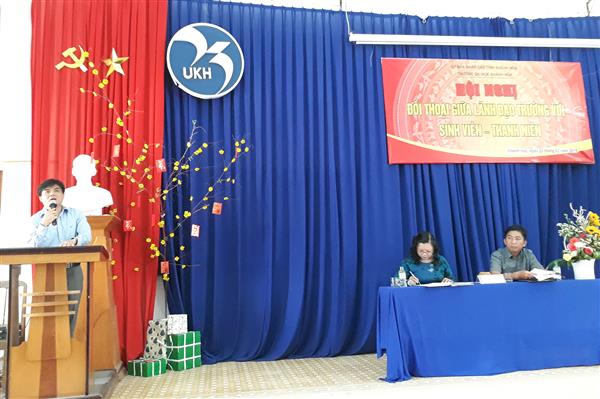 Tham dự hội nghị đối thoại giữa lãnh đạo trường với Sinh viên - Thanh niên năm học 2018-2019 có trưởng các Phòng ban, Khoa, Đoàn trường, Thư viện...và đại diện sinh viên là cán bộ Đoàn của các lớp trong Trường Đại học Khánh Hòa.