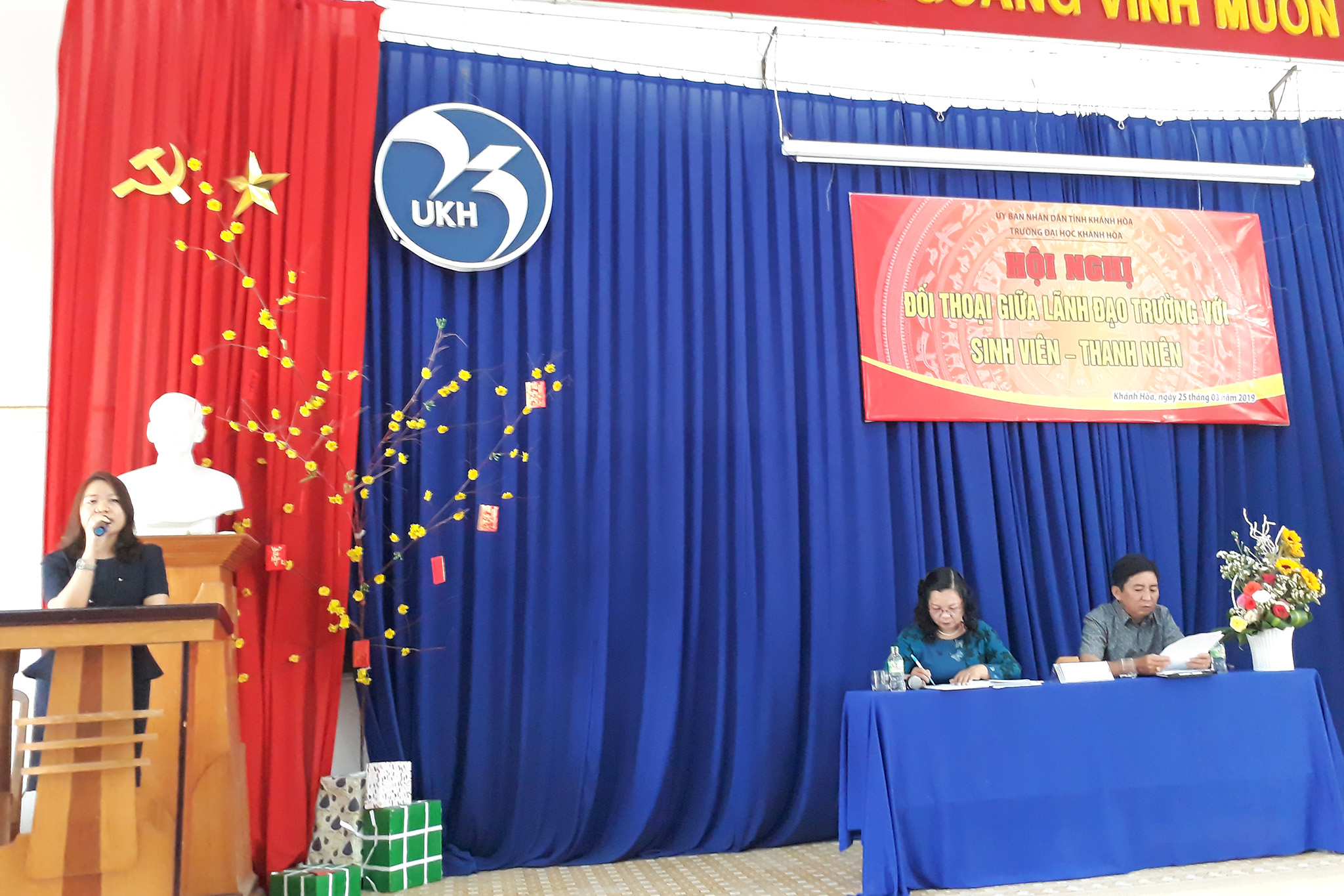 Sáng ngày 25 tháng 3 năm 2019, Hội nghị đối thoại giữa lãnh đạo trường với Sinh viên - Thanh niên năm học 2018-2019 do cô Nguyễn Thị Thanh Hằng - Phó hiệu trưởng nhà trường chủ trì đã được tổ chức tại giảng đường 1 Trường Đại học Khánh Hòa.