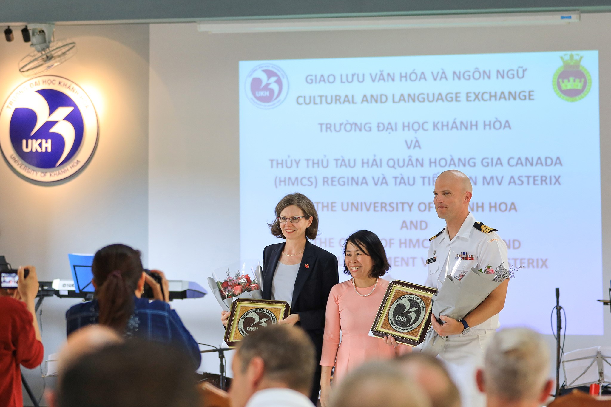Chiều 10-6, Trường Đại học Khánh Hòa đã phối hợp cùng Đại sứ quán Canada tại Việt Nam tổ chức Chương trình Giao lưu Văn hóa - Ngôn ngữ giữa giảng viên, sinh viên nhà trường và đoàn thuỷ thủ tàu khu trục tuần tra Regina và tàu tiếp vận hậu cần Asterix của Hải quân Hoàng gia Canada. Chương trình Giao lưu Văn hóa - Ngôn ngữ giữa Trường Đại học Khánh Hòa và Đoàn Thủy thủ tàu Hải quân Hoàng gia Canada - HMCS Regina cùng tàu tiếp vận hậu cần MV Asterix là một trong những hoạt động tiêu biểu trong chuỗi các hoạt động trong khuôn khổ chuyến thăm tỉnh Khánh Hòa của tàu Hải quân Hoàng gia Canada - HMCS Regina cùng tàu tiếp vận hậu cần MV Asterix. Chương trình giao lưu nhằm mục đích tăng cường sự hiểu biết về ngôn ngữ, văn hóa Việt Nam - Canada cũng như nâng cao tinh thần gắn kết trong cộng đồng.