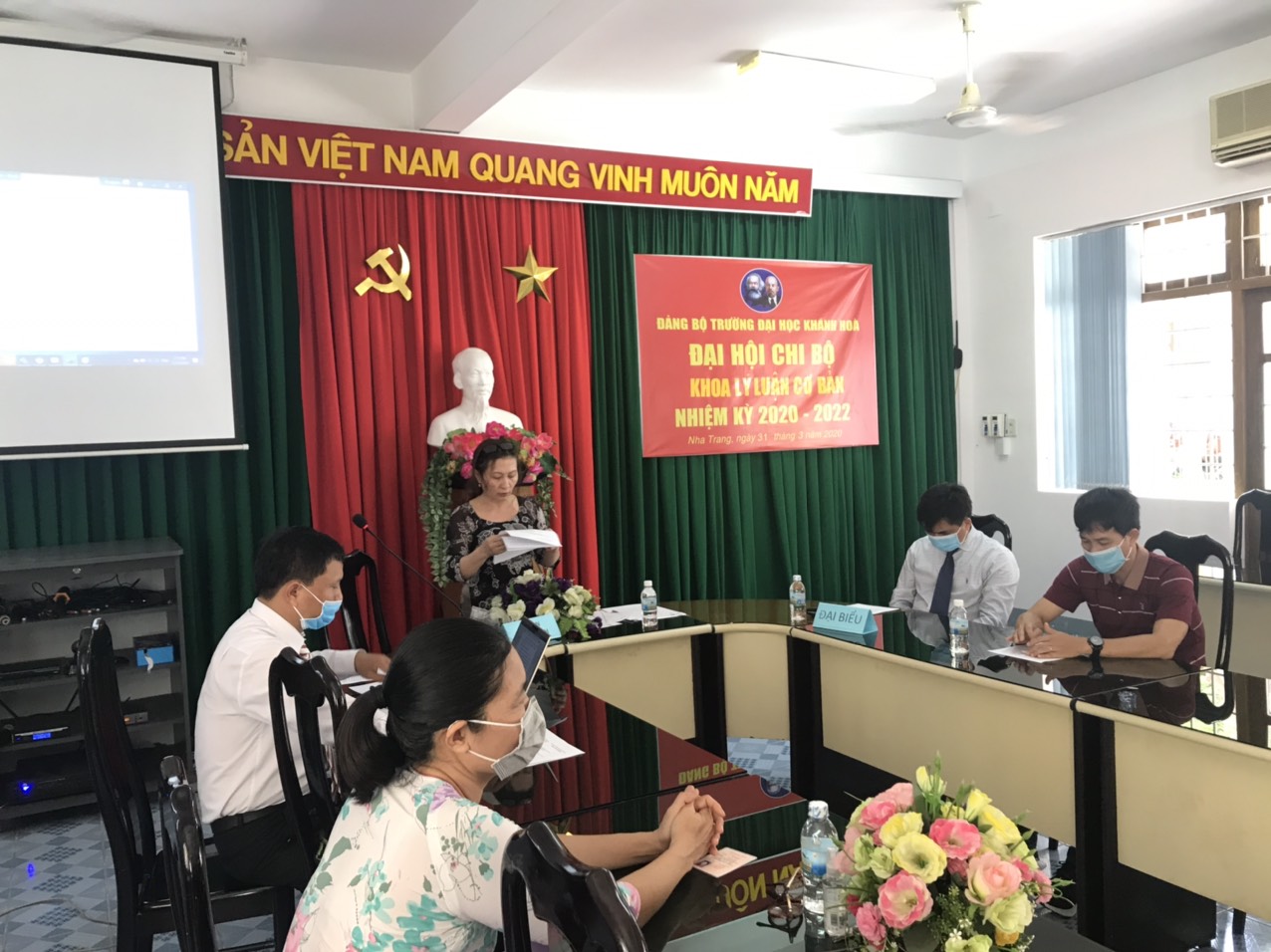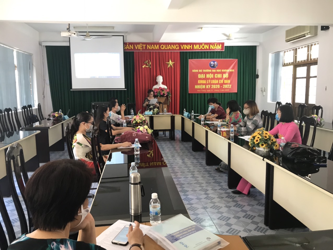 Thực hiện ý kiến chỉ đạo của Đảng ủy trường Đại học Khánh Hòa về Kế hoạch tổ chức Đại hội các Chi bộ trực thuộc, nhằm tiến tới Đại hội Đảng bộ trường nhiệm kỳ 2020 – 2025. Chiều ngày 31/3/2020, tại Phòng họp 1 (Cơ sở 1), khoa Lý luận cơ bản đã tổ chức đại hội Chi bộ nhiệm kỳ 2020 - 2022. Tham dự đại hội có đồng chí Phan Phiến, ĐUV, Phó hiệu trưởng nhà trường; đồng chí Nguyễn Hữu Tường, tổ trường Công đoàn khoa, cùng toàn thể 13 đảng viên trong Chi bộ.