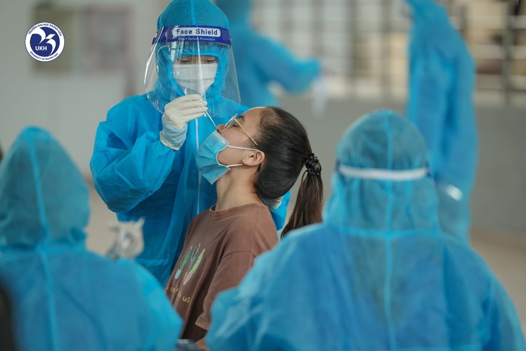 Ảnh: Sinh viên tình nguyện Trường Đại học Khánh Hòa hỗ trợ công tác test nhanh Covid-19 trong 3 ngày 1,2 và 3/11 đối với toàn bộ sinh viên học trực tiếp tại trường