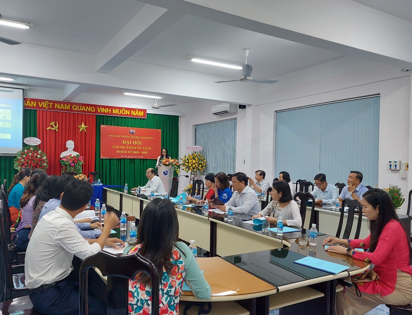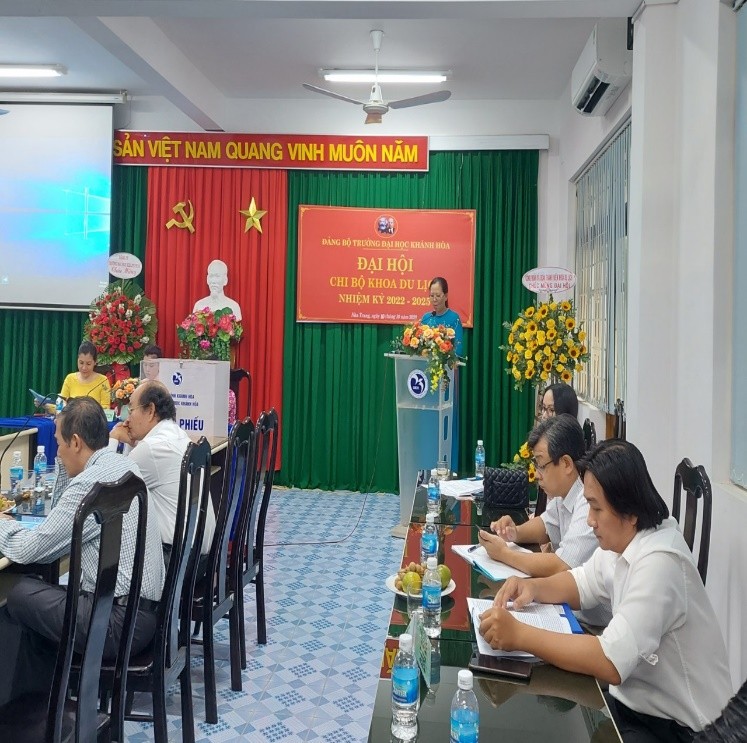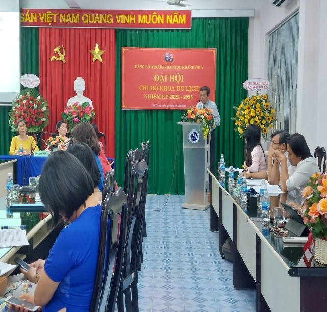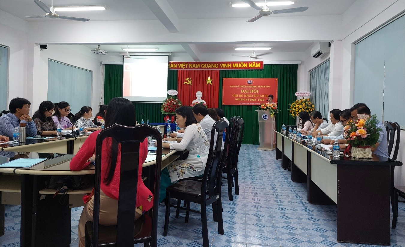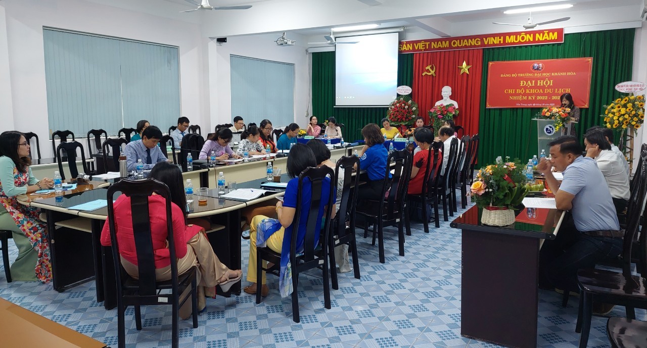 Thực hiện Công văn số 1999-CV/BTCTU ngày 19/4/2022 của Ban Tổ chức Tỉnh ủy v/v hướng dẫn tổ chức đại hội Chi bộ trực thuộc Đảng ủy cơ sở, Đảng ủy bộ phận nhiệm kỳ 2022 – 2025; và theo Công văn số 20-KH/ĐU ngày 18/8/2022 của Đảng ủy Trường Đại học Khánh Hòa về Kế hoạch tổ chức đại hội các Chi bộ trực thuộc Đảng ủy Trường Đại học Khánh Hòa nhiệm kỳ 2022 - 2025. Đồng thời được sự nhất trí của Ban Thường vụ Đảng uỷ Trường Đại học Khánh Hòa. Vào lúc 8h ngày 10/10/2022, tại phòng họp 1, Chi bộ khoa Du lịch đã long trọng tổ chức Đại hội chi bộ nhiệm kỳ 2022-2025.