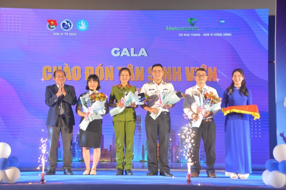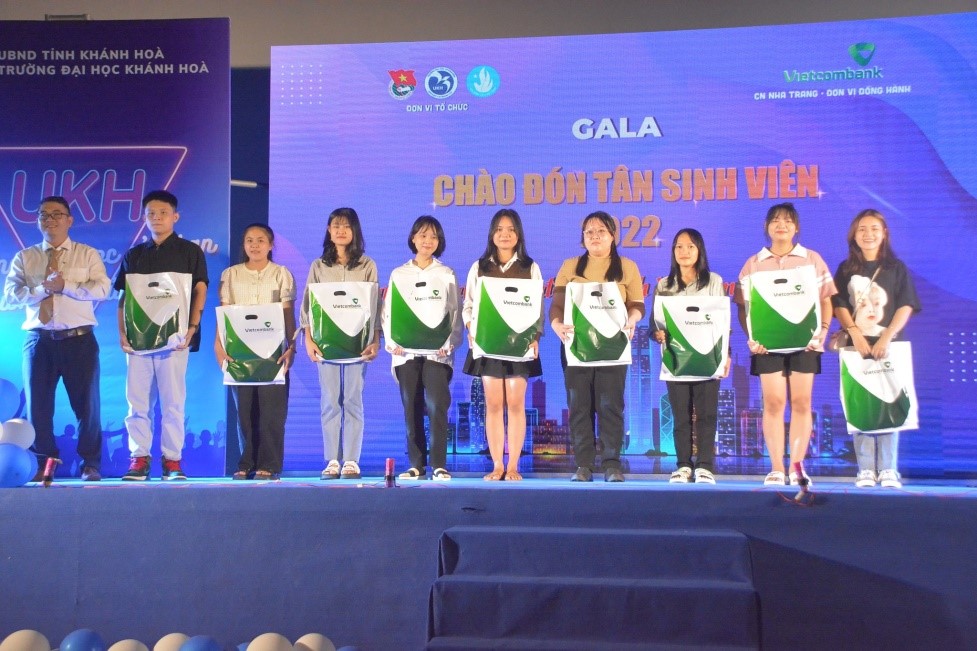 Cũng trong khuôn khổ chương trình, Đại diện đơn vị đồng hành Ngân hàng TMCP Ngoại thương Việt Nam (Vietcombank) chi nhánh Nha Trang đã trao các phần quà cho các bạn Tân sinh viên là thủ khoa đầu vào trong năm học 2022 – 2023.