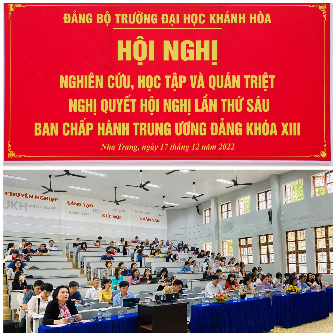 Thực hiện Kế hoạch số 113-KH/TU ngày 23/11/2022 của Ban Thường vụ Tỉnh ủy về tổ chức nghiên cứu, học tập, quán triệt và tuyên truyền Nghị quyết Hội nghị lần thứ sáu Ban Chấp hành Trung ương Đảng khóa XIII; Kế hoạch số 25-KH/ĐU ngày 01/12/2022 của Đảng ủy Trường, ngày 17/12/2022, tại Giảng đường 1, Đảng ủy Trường Đại học Khánh Hòa đã tổ chức Hội nghị nghiên cứu, học tập và quán triệt Nghị quyết Hội nghị lần thứ sáu Ban chấp hành Trung ương Đảng khoá XIII.