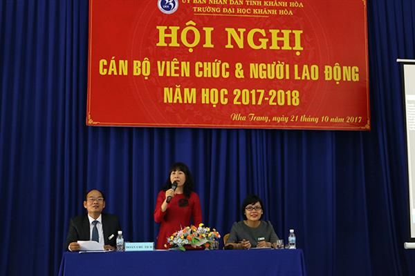Sau khi tổ chức thảo luận, và trả lời các góp ý của các đại diện đơn vị Phòng, Khoa, Trung tâm về phương hướng, nhiệm vụ và các giải pháp giúp nhà trường nâng cao hiệu quả đào tạo trong năm học 2017-2018 tại Hội nghị. Đồng chí Thái Thị Phương Thảo đã thay mặt Ban thư ký trình bày toàn văn dự thảo nghị quyết của Hội nghị CBCC,VC và NLĐ Trường Đại học Khánh Hòa năm học 2017-2018.