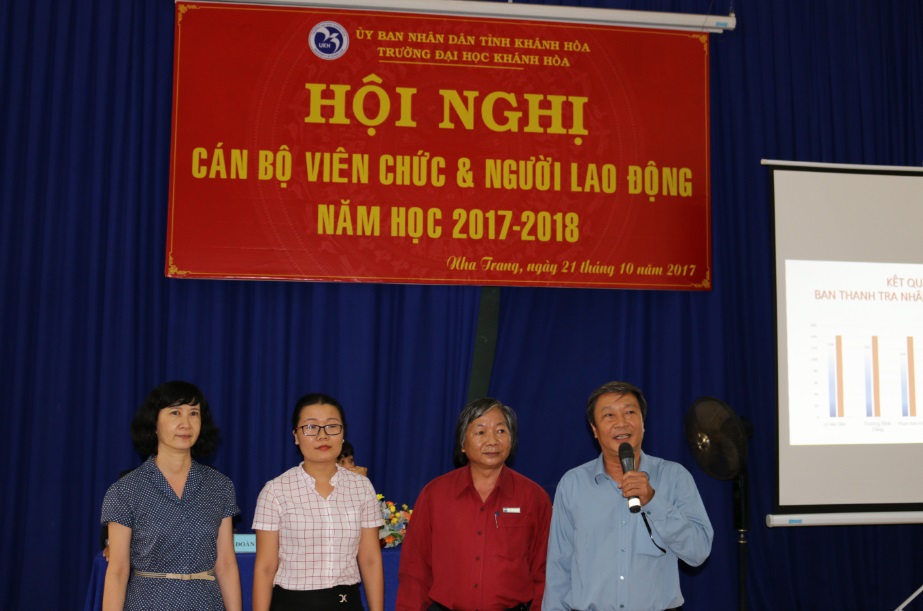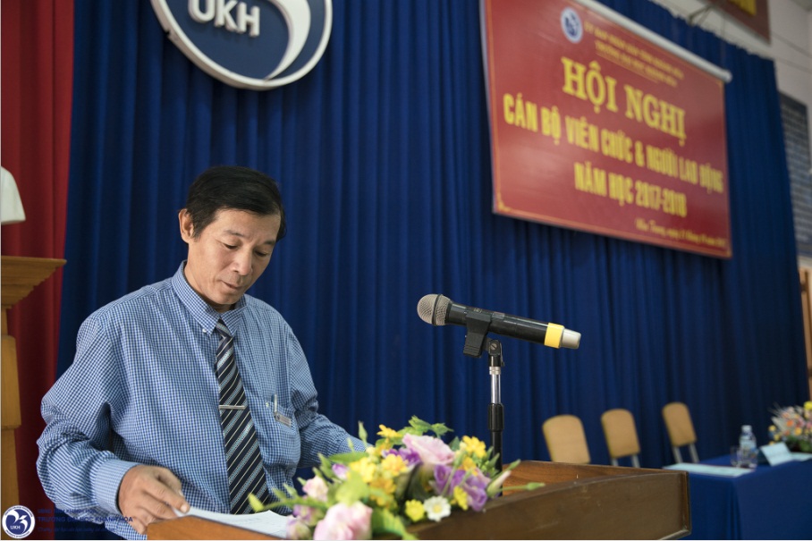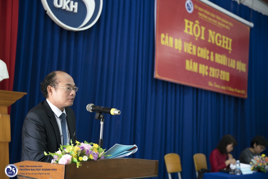 Mở đầu hội nghị, TS.Chu Đình Lộc - Phó bí thư Đảng ủy, Phó Hiệu trưởng đã trình bày Báo cáo tổng kết năm học 2016-2017 và Phương hướng nhiệm vụ năm học 2017-2018. Hội nghị cũng đã được nghe Báo cáo tình hình triển khai hội nghị CBCC&NLĐ của các đơn vị và tổng hợp ý kiến góp ý do Đ/c Lê Văn Thành - Trưởng phòng Tổ chức - Hành chính trình bày, Báo cáo thu chi tài chính năm học 2016-2017 do Đ/c Trần Thị Kim Oanh - Kế toán trưởng trình bày, Báo cáo kết quả thanh tra nhân dân năm học 2016 -2017 do Đ/c Lê Văn Dần trình bày, Báo cáo tổng kết và phát động thi đua Trường Đại học Khánh Hòa năm học 2017 -2018 do Đ/c Chu Đình Lộc - Phó Hiệu trưởng trình bày.