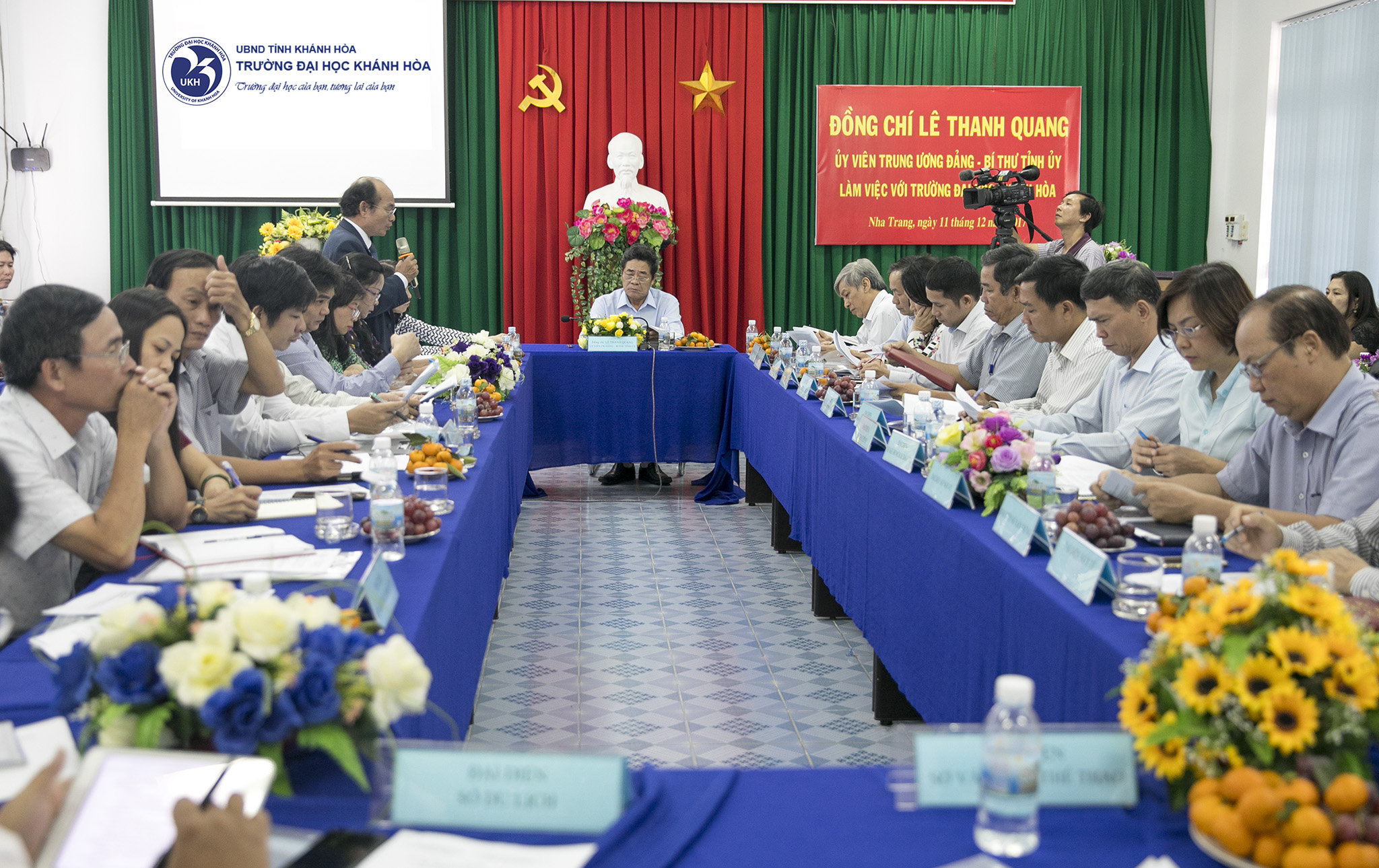 Chiều 11-12, ông Lê Thanh Quang - Ủy viên Trung ương Đảng, Bí thư Tỉnh ủy chủ trì buổi làm việc với Trường Đại học (ĐH) Khánh Hòa về tình hình thực hiện các nhiệm vụ công tác. Cùng tham dự có các ông: Lê Xuân Thân - Trưởng Đoàn đại biểu Quốc hội tỉnh, Phó Chủ tịch HĐND tỉnh; Nguyễn Đắc Tài - Phó Chủ tịch UBND tỉnh, Chủ tịch Hội đồng Trường ĐH Khánh Hòa và đại diện các sở, ban, ngành liên quan.