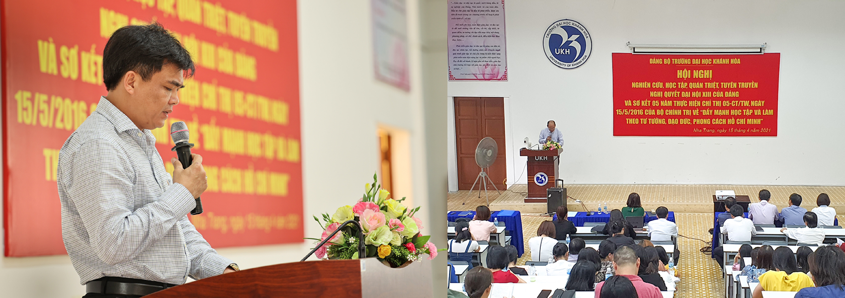 Chiều ngày 15/4/2021, Hội nghị Sơ kết 5 năm thực hiện chỉ thị 05-CT/TW của Bộ Chính trị đã được tổ chức tại Giảng đường 1 Trường Đại học Khánh Hòa. Tham dự hội nghị có TS. Lê Thị Mỹ Bình – Bí thư Đảng ủy, Chủ tịch Hội đồng trường; TS. Phan Phiến – Phó Bí thư Đảng ủy, Hiệu trưởng nhà trường; PGS.TS. Chu Đình Lộc – Phó Bí thư Đảng ủy, Phó Hiệu trưởng nhà trường cùng toàn thể cán bộ, giảng viên Trường Đại học Khánh Hòa.