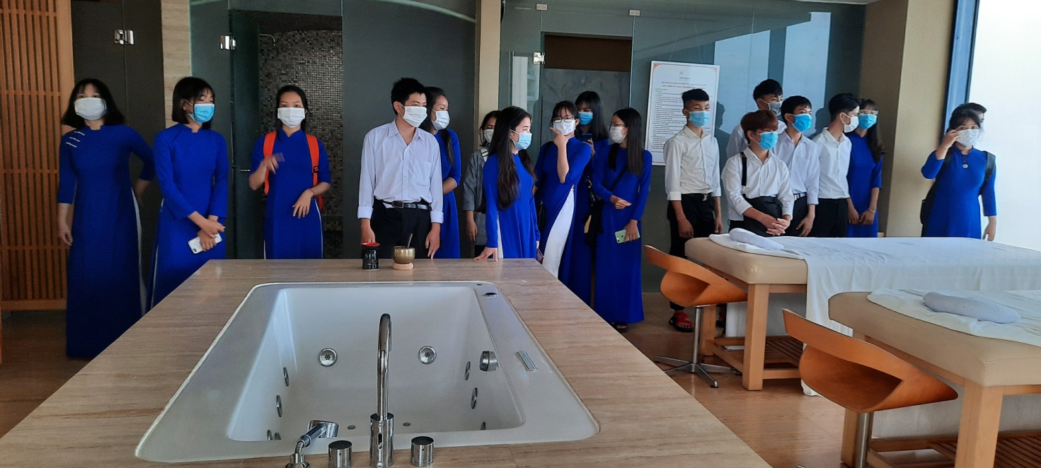 Trong chuyến tham quan thực tế, các em sinh viên đã được tham quan các dịch vụ phòng, nhà hàng, spa, gym, bể bơi… Ngoài việc tham quan, các em được bà Hoàng Thuỵ Ngọc Trúc – Nhân viên đào tạo của khách sạn Sheraton Nha Trang giới thiệu tận tình các dịch vụ và chức năng của các bộ phận trong khách sạn nhằm giúp các em hiểu rõ hơn về ngành nghề mà mình đang theo học.