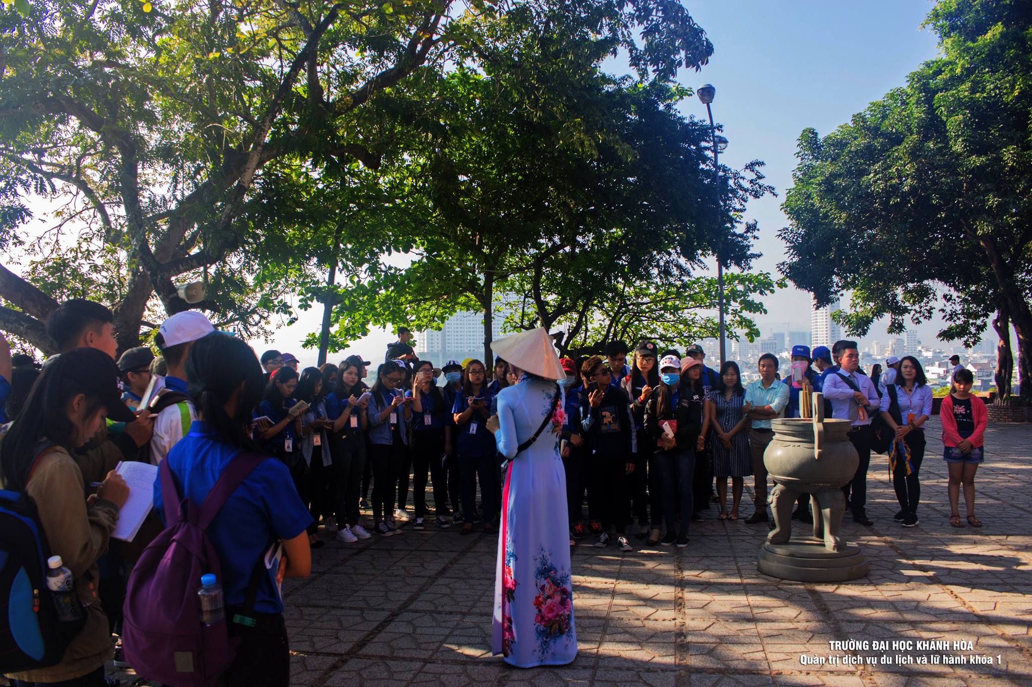 Hình 2: Cả lớp đang nghe giới thiệu sản phẩm du lịch và các tổ chức cho du khách thăm quan tại điểm du lịch Tháp Bà Ponaga - TP.Nha Trang.