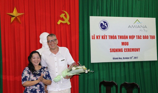 Ảnh 1: Bên trái Phó hiệu trưởng Đại học Khánh hòa, bên phải Tổng quản lý Amiana Nha Trang Resort