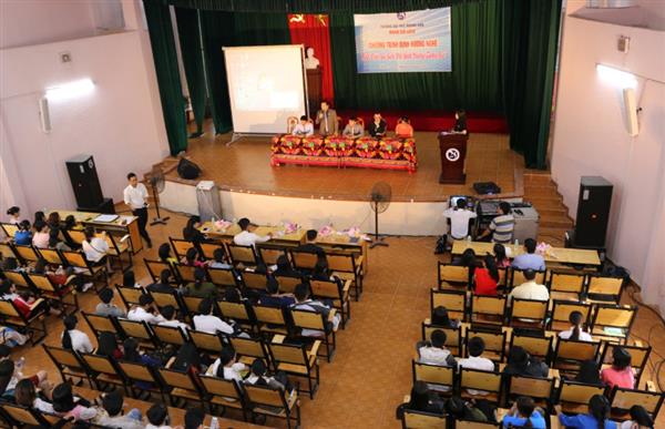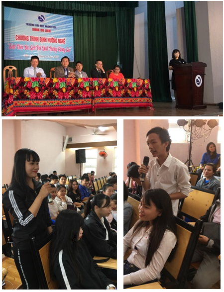 Ảnh : Các doanh nghiệp du lịch đang đối thoại và định hướng nghề du lịch cho sinh viên Đại học Khánh Hòa.