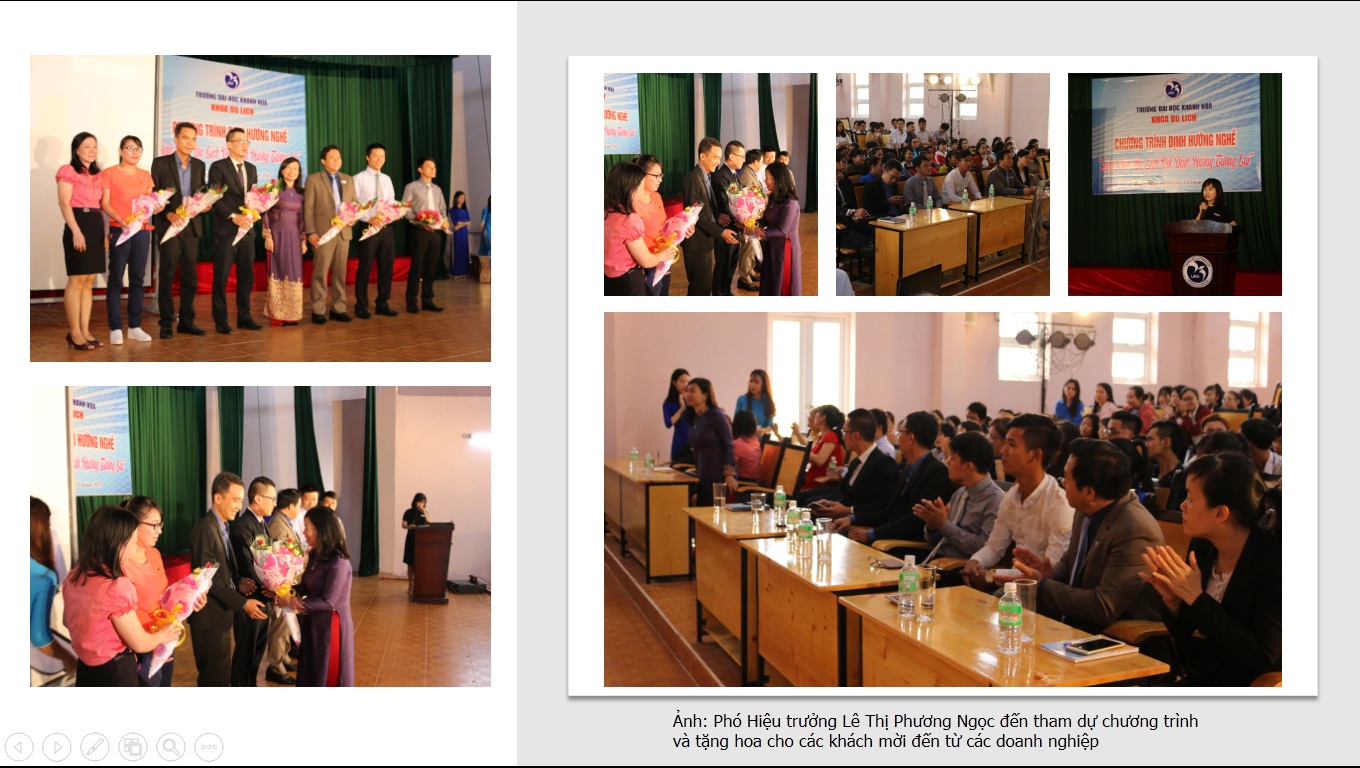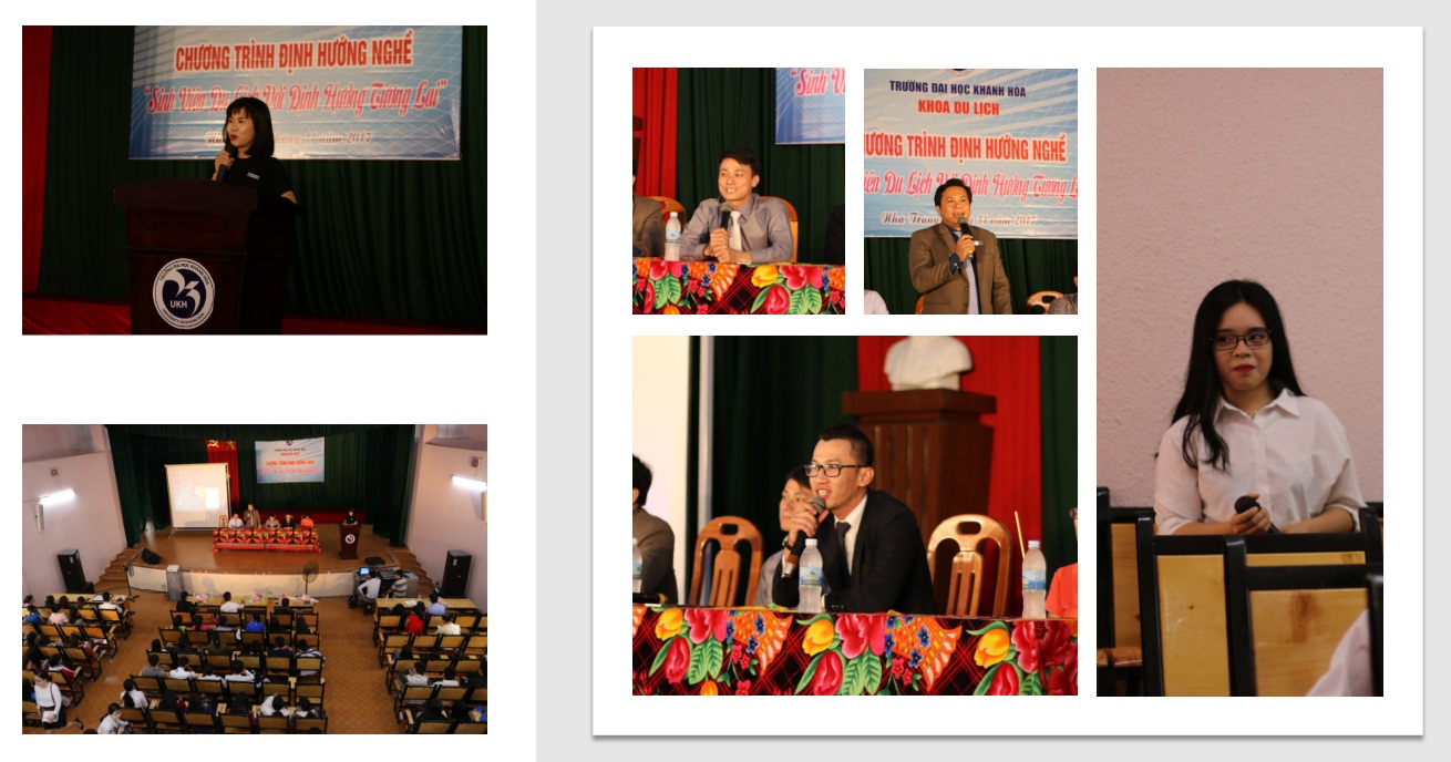 Sáng ngày 24/11/2017 tại Nhà biểu diễn - trường Đại học Khánh Hòa, chương trình “SINH VIÊN DU LỊCH VỚI ĐỊNH HƯỚNG TƯƠNG LAI” đã được tổ chức. Đây là hoạt động của khoa Du Lịch nhằm giúp sinh viên xác định được sở thích và thế mạnh của bản thân, có những hoạt động giải trí lành mạnh, biết cách phân bố thời gian học tập và đi làm thêm phù hợp, định hướng nghề nghiệp cũng như hoạch định cho việc phát triển của bản thân trong tương lai.