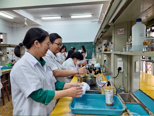 Hình 3: Các chị em ban nữ công trường Đại học Khánh Hòa cùng nhau làm nước rửa chén thiên nhiên để sử dụng tại hộ gia đình, chung tay bảo vệ môi trường
