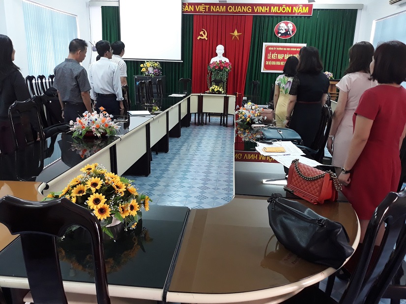 Sáng ngày 08/3/2018, tại Phòng họp 1, Trường Đại học Khánh Hòa, Chi bộ Khoa Khoa học Xã hội và Nhân văn làm lễ kết nạp Đảng viên mới cho đồng chí Trương Quang Đức- Lớp Sư phạm Địa –Sử K41 và chuyển Đảng chính thức cho đồng chí Nguyễn Thị Kim Hằng.