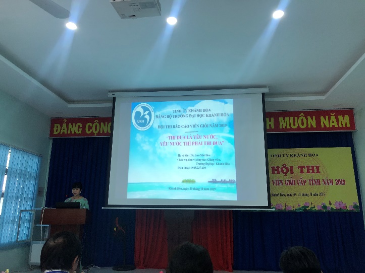 Đặc biệt, có sự tham gia của 16 đồng chí báo cáo viên, đại diện cho 14/15 huyện ủy, thị ủy, thành ủy, các đảng ủy trực thuộc Tỉnh ủy. Đồng chí Lưu Mai Hoa - giảng viên Khoa Lý luận cơ bản được Đảng bộ Trường Đại học Khánh Hòa cử tham gia báo cáo tại hội thi với chủ đề “Thi đua là yêu nước, yêu nước thì phải thi đua”. Trình bày báo cáo, đồng chí Mai Hoa đã làm sáng tỏ tư tưởng Hồ Chí Minh về thi đua yêu nước và sự vận dụng của Trường Đại học Khánh Hòa.