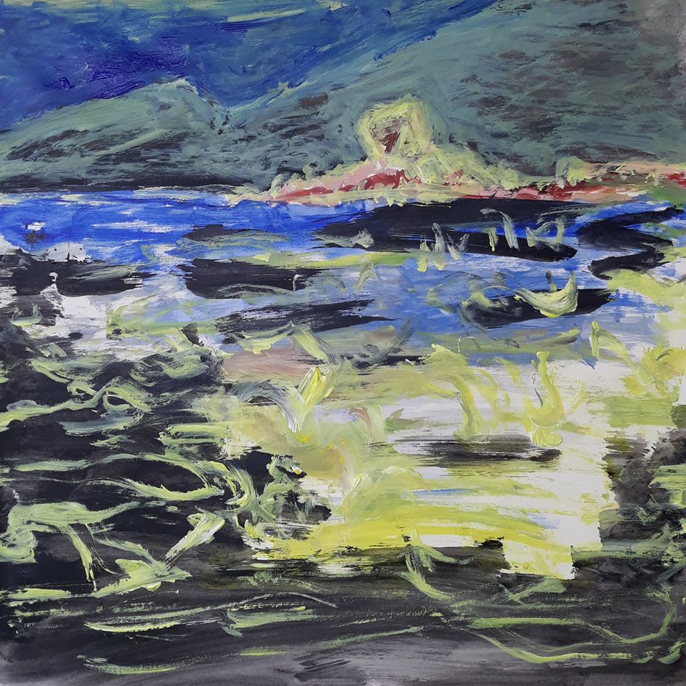 Đám cọ vẽ của Lê Dần cứ tung tẩy, cứ nhảy nhót từng vệt, loằng ngoằng từng sợi, mà gợi Biển, gợi Sen, và thậm chí là gợi được cả cốt cách Đàn bà. Lê Dần hình như chẳng đắn đo, chẳng nặng nợ đời, vẽ vời với anh như chỉ là chuyến đi “phượt” thích thú, ngó trời mà vẽ biển, ngó sen mà vẽ đàn bà, không trúng “anatomy” nhưng chẳng trật cái hồn riêng, vía lạ vốn chỉ anh mới “khai quật” được. Tranh của Lê Dần. Thật chả thu hút mắt nhìn tẹo nào vì sắc màu “nghèo” quá, tối sáng đậm nhạt cứ tạt qua tạt về góc phải góc trái. Điểm vàng điểm bạc trong tranh của anh thật lẫn lộn cả mớ, họa hoằn lắm mới trồi lên vài mảng, vài vệt nong nóng trên nền sắc lạnh. Ấy chỉ vậy mà thành cái neo, cái níu, giữ mắt kẻ nhìn, thôi miên tâm trí những kẻ chán mớ tiệc đời ngồn ngộn đỏ xanh muốn tìm về sự tối giản trong vùng gốc của ký ức thời trần truồng con trẻ. Chẳng dễ gì để từ bỏ những bài học hàn lâm thời hung hăng mông muội. Chắc phải cào, phải cấu bỏ lắm những “dục sắc” giảng đường, Lê Dần mới trở về được với dưa cà mắm muối, tịnh và thanh như Sen Đông, tàn mà hình như không lụi, như Hòn Chồng “nát” mà hình như chẳng tan.
