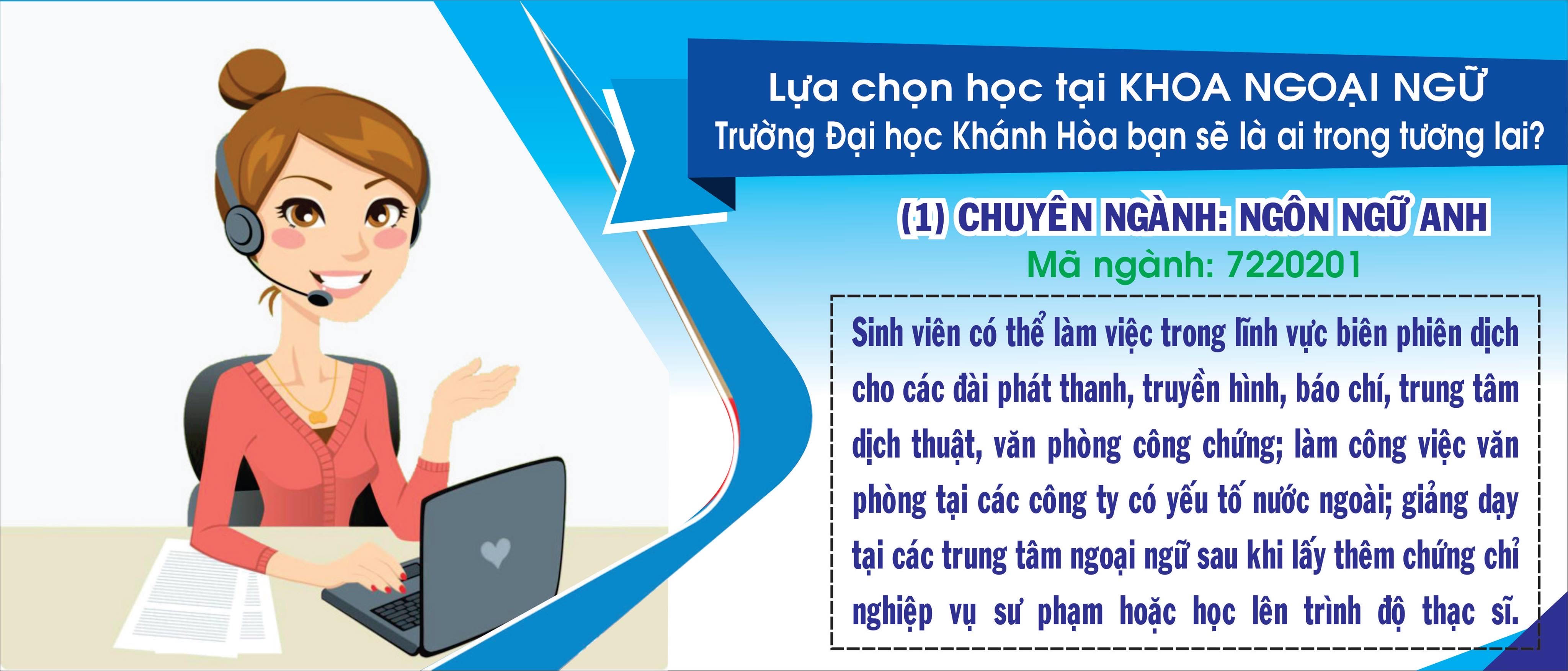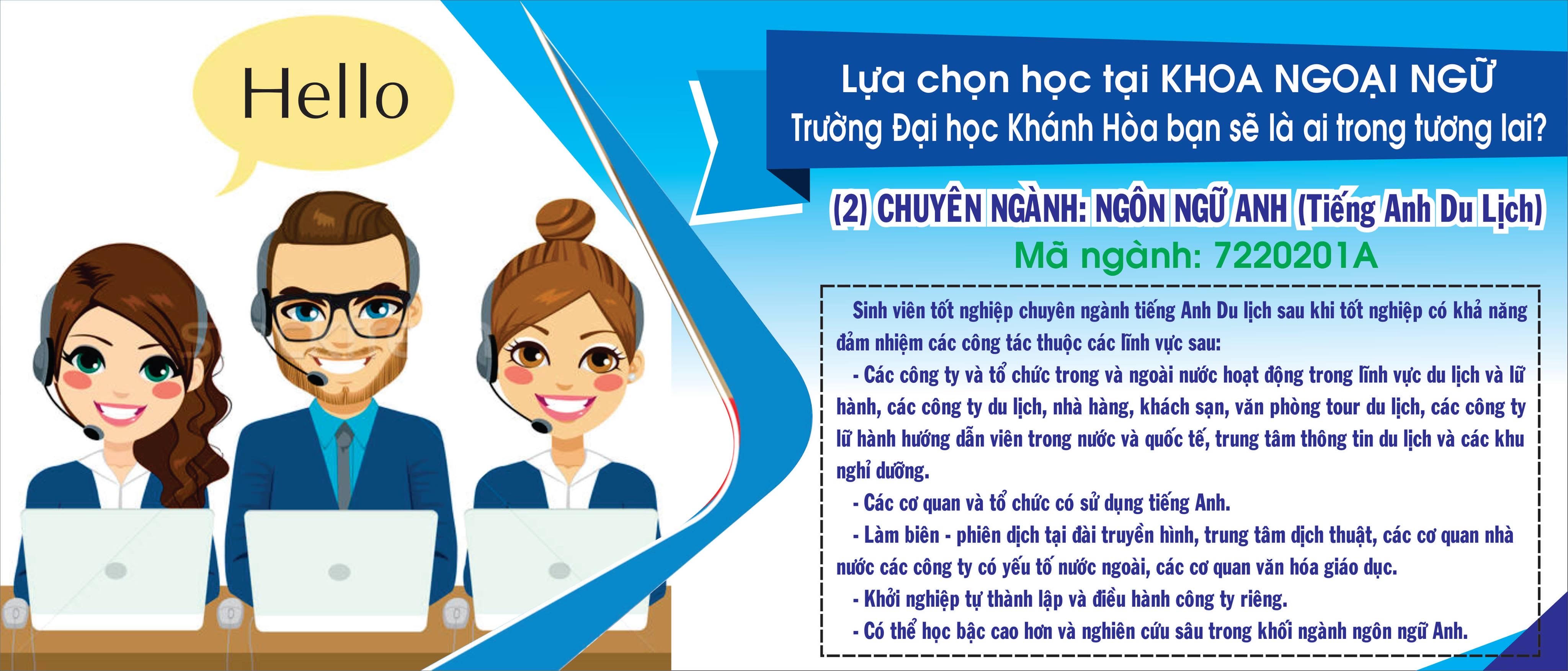 Vậy thì còn chần chừ gì nữa. Hãy đến với Khoa Ngoại ngữ, Trường Đại học Khánh Hòa : Bạn sẽ giải đáp được những băn khoăn của mình với hai ngành học để bạn lựa chọn. Đó là ngành Ngôn ngữ Anh (Chuyên ngành : Ngôn ngữ Anh) và ngành Ngôn ngữ Anh (Tiếng Anh Du lịch).