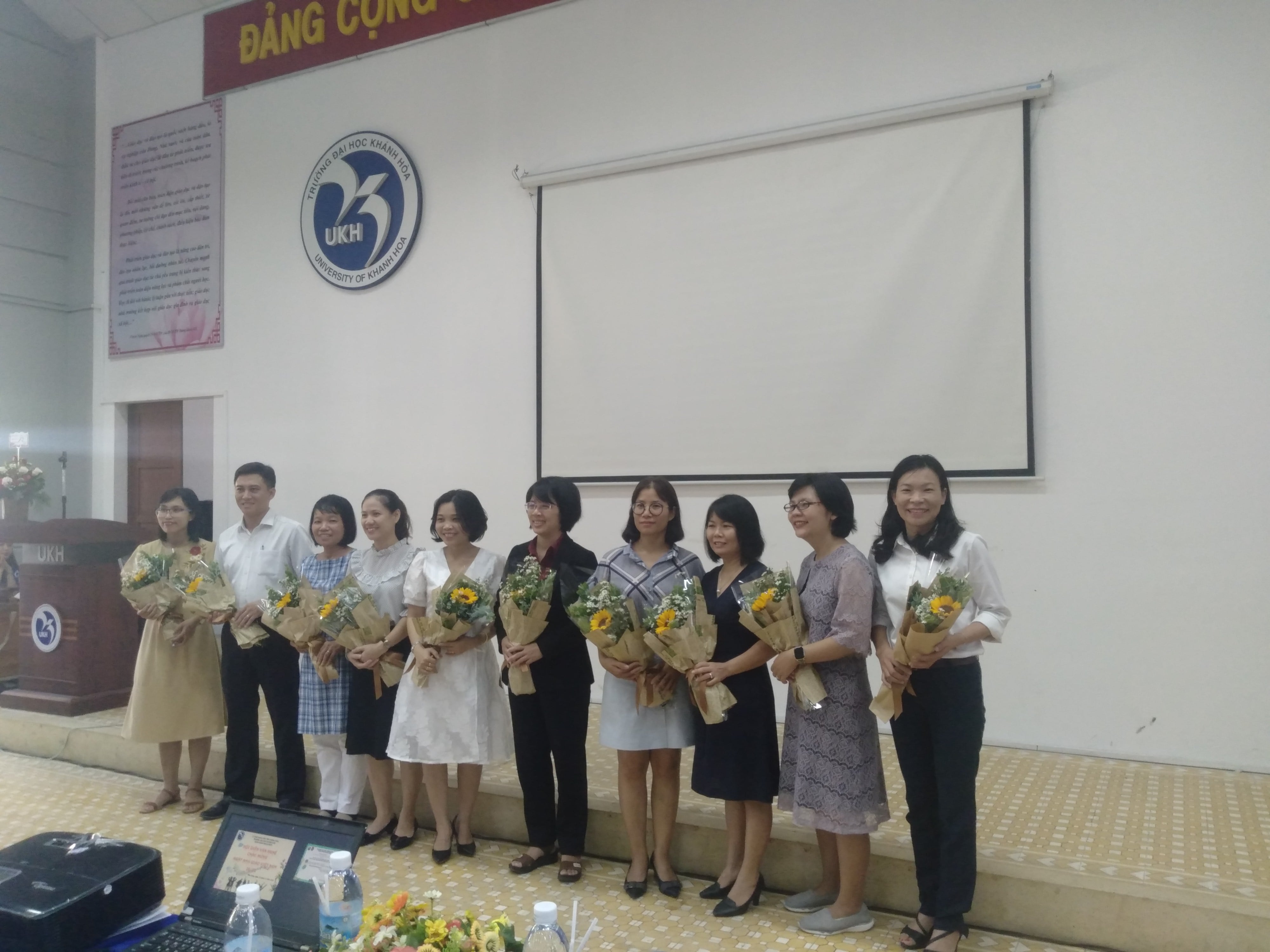 Hình 2. Tập thể giảng viên nhận hoa tri ân của các sinh viên khoa Ngoại ngữ