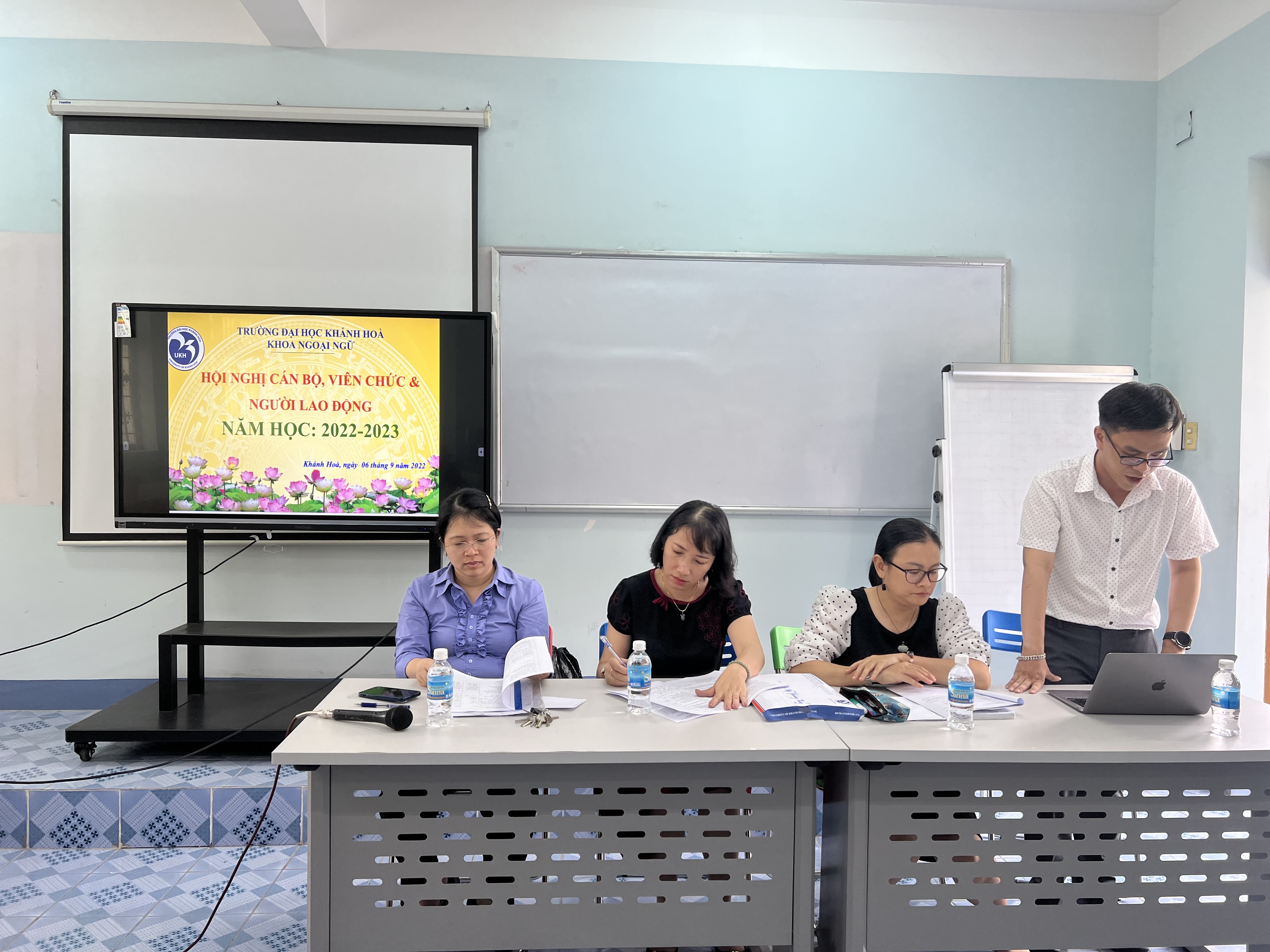Dưới sự chủ trì của Đoàn Chủ tịch, Hội nghị đã diễn ra nghiêm túc và khẩn trương. Hội nghị đã thông qua báo cáo thực hiện Nghị quyết HNCBVC & NLĐ năm 2021-2022; Tiến hành thảo luận lấy ý kiến góp ý, xây dựng của cán bộ viên chức khoa Ngoại ngữ cho bản dự thảo Báo cáo tổng kết năm học 2021-2022 và Phương hướng năm học 2022-2023. Bầu đoàn đại biểu dự Hội nghị Đại biểu CBCV&NLĐ Trường Đại học Khánh Hòa năm học 2022-2023 gồm các đại diện tiêu biểu của khoa Ngoại ngữ.