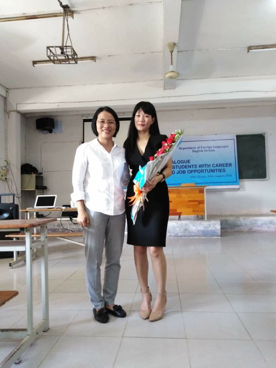Hình 2 : Cô Đinh Thị Lam Trà, giảng viên Khoa Ngoại ngữ, MC của chương trình chụp hình lưu niệm với cô Đào Thu Hiền.