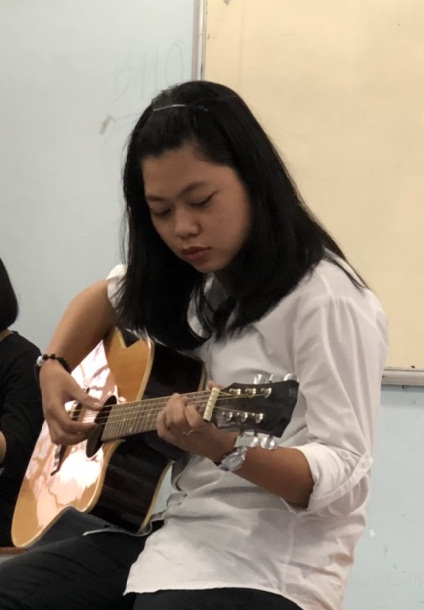 Hình 1 : Sinh viên Đặng Bảo Trân vừa đệm đàn vừa hát. (Ảnh : cô Lam Trà)
