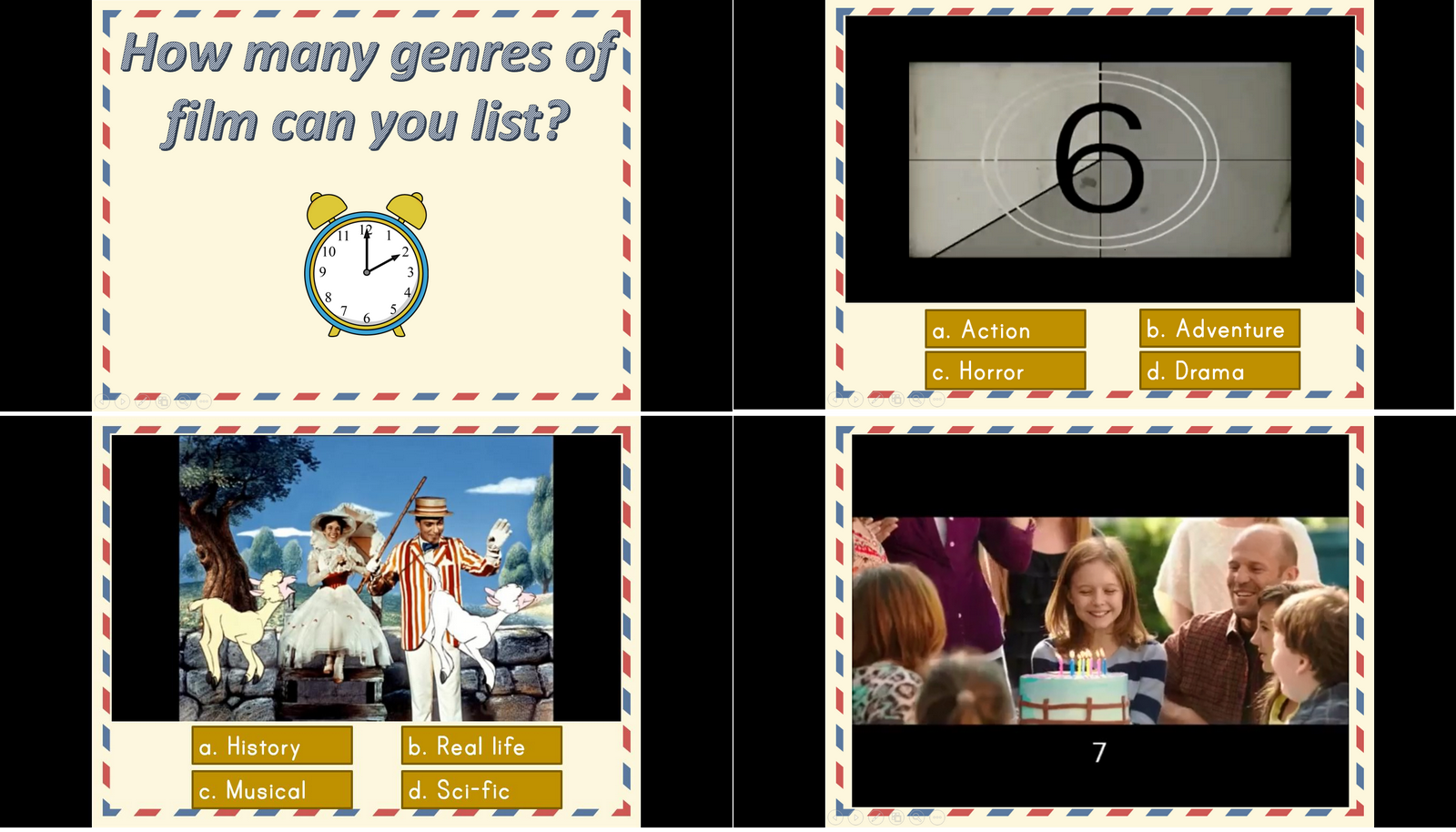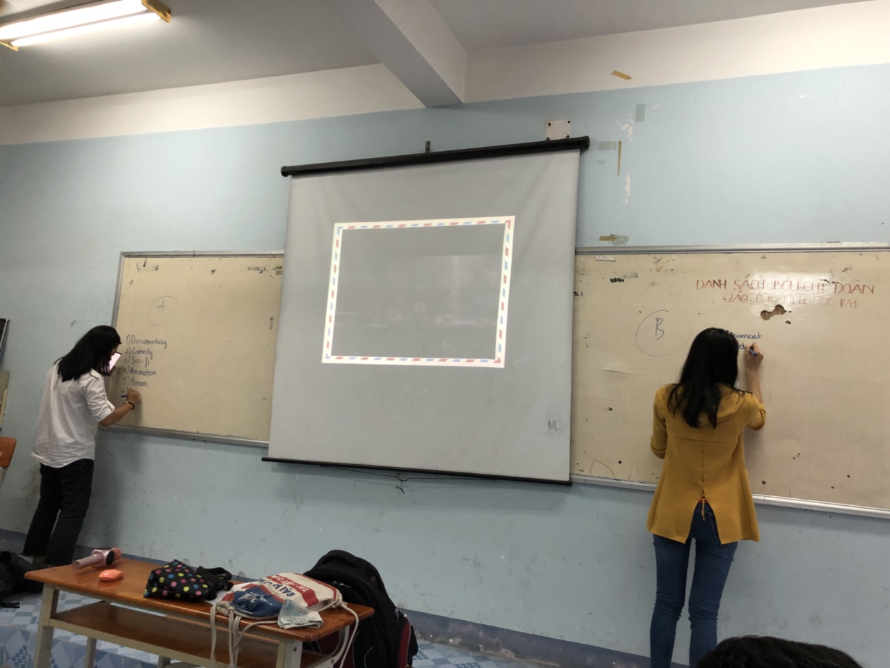 Sau phần khởi động bằng cách nêu tên những thể loại phim khác nhau, các thành viên câu lạc bộ đã được xem nhiều trích đoạn phim và chia thành các nhóm cùng thảo luận sôi nổi để tìm ra đáp án. Những phần quà nho nhỏ đành cho người chiến thắng đã đem lại sự khích lệ và thích thú cho buổi sinh hoạt. Cuối bài báo cáo, cô Hạnh cũng chia sẻ về những ích lợi của phim ảnh đối với việc dạy và học tiếng Anh.