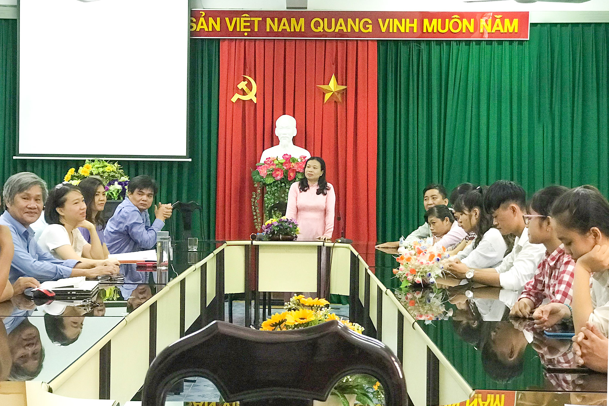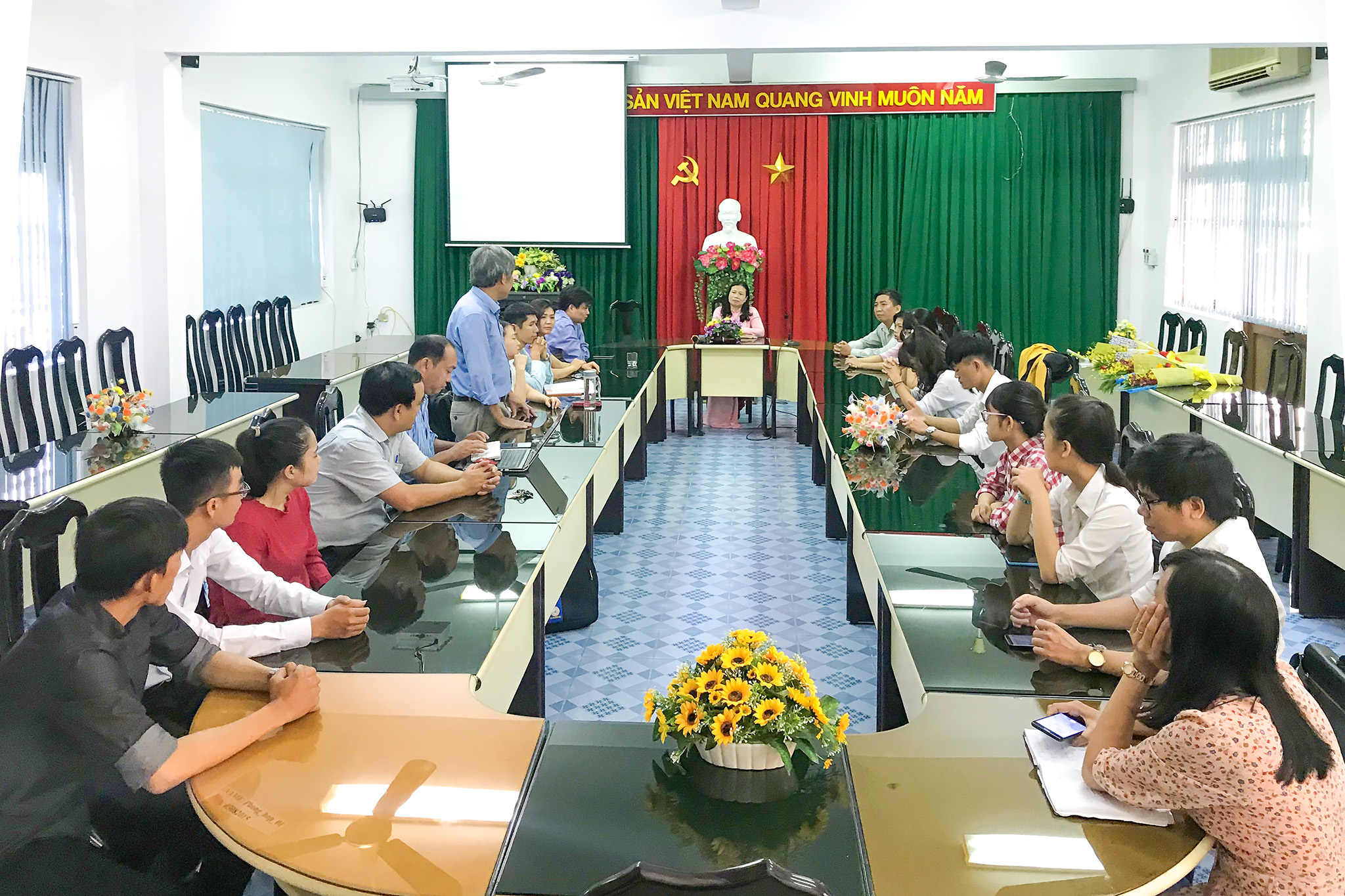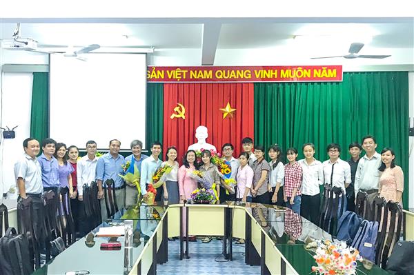 Hình 4. Lãnh đạo nhà trường tặng hoa và chụp hình lưu niệm cùng toàn đoàn
