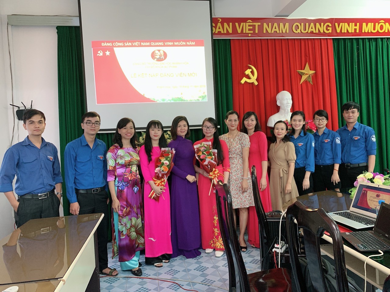 Căn cứ vào thực tế phấn đấu của 2 quần chúng: Phạm Thị Son và Lê Thị Hoàng Vy là những SV ưu tú của lớp Đại học Sư phạm Ngữ văn K1; được sự đồng ý của Đảng ủy Trường Đại học Khánh Hòa, Chi bộ Khoa Sư phạm đã tổ chức lễ kết nạp Đảng viên mới vào lúc 9h00 ngày 18/11/2019 tại Phòng họp 1.