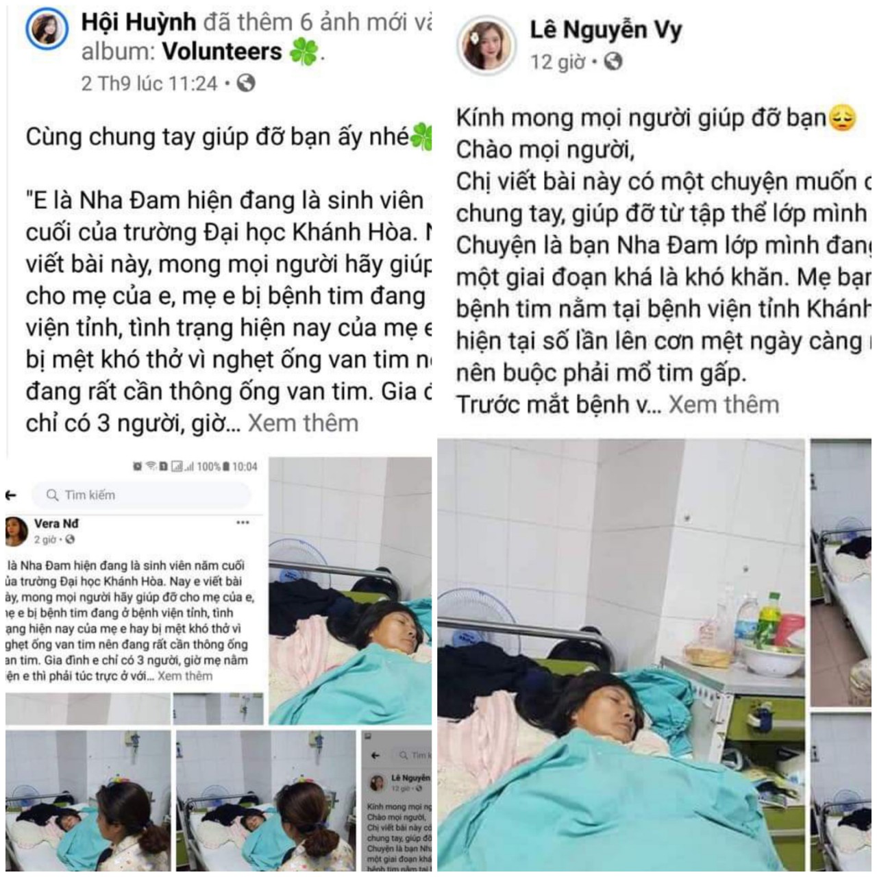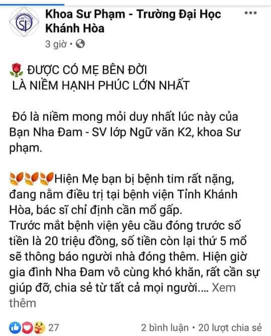 Với hoàn cảnh cô Nguyễn Thị Hường (mẹ của bạn Nguyễn Nhụy Nha Đam, sinh viên năm 4, lớp Sư phạm Ngữ Văn K2) bị nghẹt ống van tim và viêm dạ dày phải nhập viện phẫu thuật gấp tại bệnh viện Đa khoa tỉnh Khánh Hòa, chiều ngày 1/9/2020, BCH lớp Sư phạm Ngữ Văn K2 đã tổ chức kêu gọi quyên góp chung tay giúp đỡ gia đình bạn. Trước những bấp bênh chật vật về kinh tế của gia đình với số tiền viện phí gấp rút lên đến 20.000.000 (hai mươi triệu đồng) cần để phẫu thuật vào rạng sáng ngày 2/9/2020, các bạn trẻ lớp Sư phạm Ngữ Văn đã tiến hành kêu gọi, đồng hành trợ giúp gia đình bạn từ những hành động thiết thực đến các trang mạng xã hội.