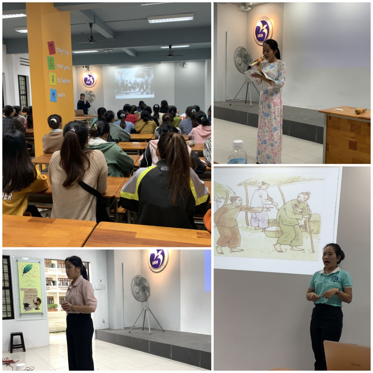 Hình 2. Sinh viên tham gia các phần thi kể chuyện, đọc diễn cảm, thiết kế giáo án điện tử