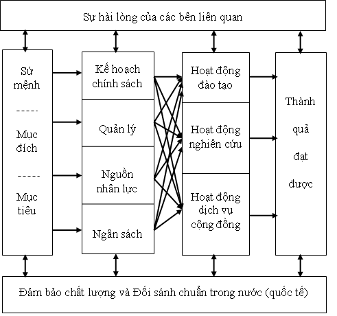 Hoạt động thứ hai của trường đại học thường là hoạt động nghiên cứu. Nếu cơ sở giáo dục đại học là cơ sở nghiên cứu thì chất lượng nghiên cứu là một khía cạnh quan trọng của chất lượng tổng thể. Mô hình cho chất lượng hoạt động nghiên cứu như sau: