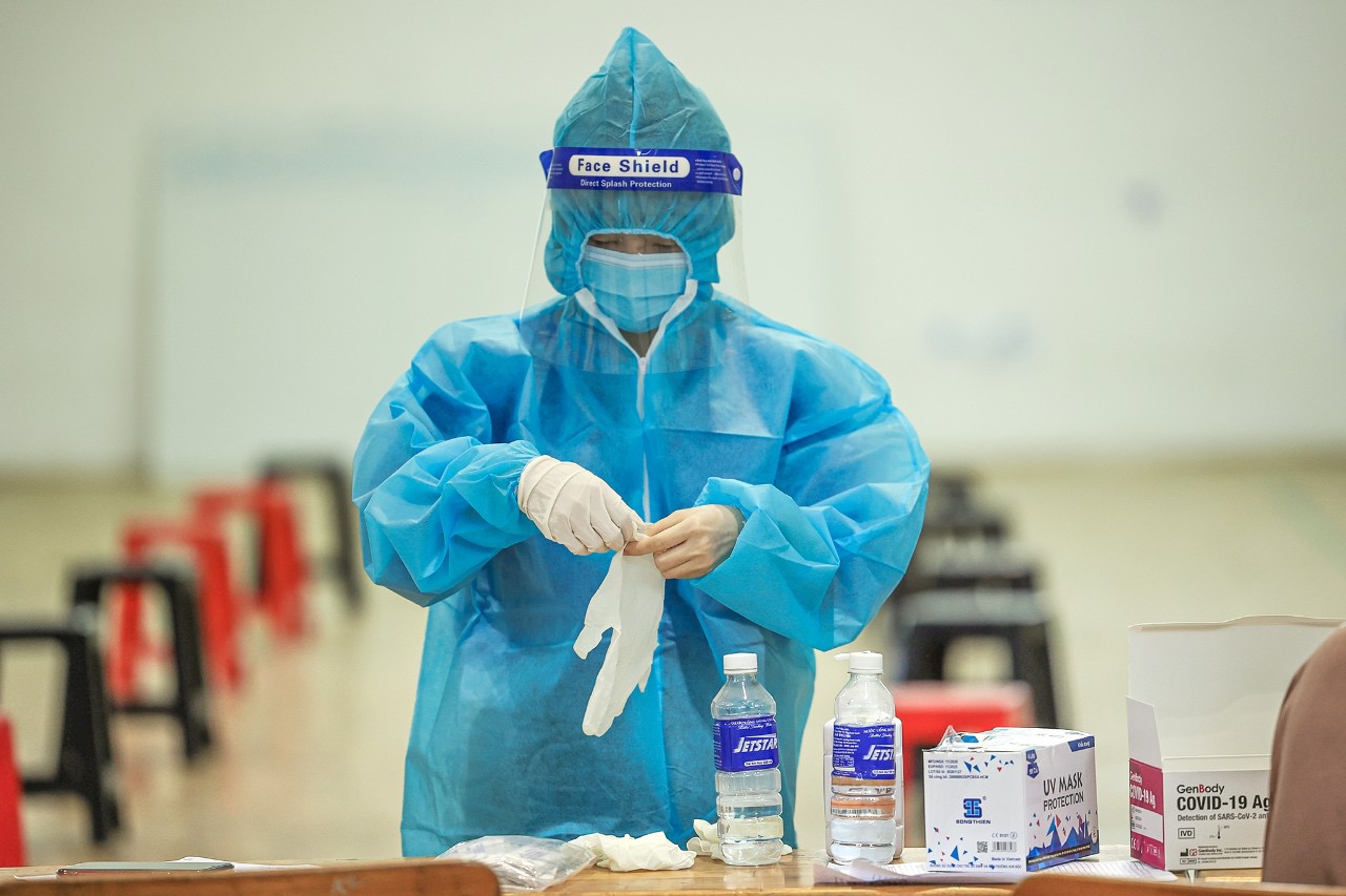 Cán bộ y tế trường chuẩn bị trước khi tổ chức thu mẫu tầm soát (Hình: Đoàn trường ĐHKH)