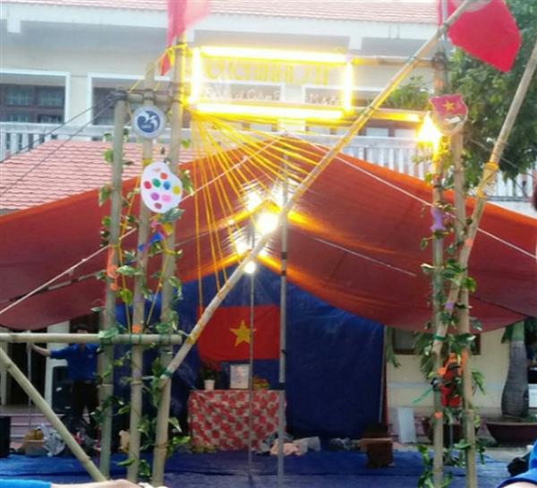 Cổng trại được làm bằng tre - vật liệu vô cùng thân thuộc với người Việt Nam, trên cùng là lá cờ Tổ quốc tung bay trong gió, hai bên là huy hiệu đoàn, logo của trường. Đồng thời cổng trại còn được trang trí bởi những sản phẩm thể hiện ngành nghề đào tạo của khoa cùng với dòng chữ nổi bật “Vượt sóng”. Tất cả đã thể hiện tinh thần, khát vọng của tuổi trẻ trong học tập, rèn luyện, muốn bay cao, bay xa, cống hiến sức trẻ, trí tuệ, xung kích đi đầu với lý tưởng cao đẹp “đâu cần thanh niên có, đâu khó có thanh niên”.