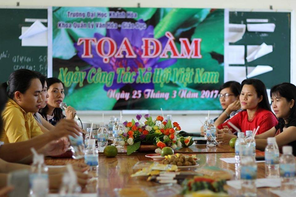 Hòa chung không khí của cả nước chào mừng ngày lễ trọng đại này, ngày 25-3-2017 Khoa Quản lý Văn hóa – Giáo dục,Trường Đại học Khánh Hòa tổ chức buổi tọa đàm chia sẻ thân mật nhằm giao lưu, chia sẻ những thuận lợi, khó khăn và những kinh nghiệm hoạt động trong nghề công tác xã hội trên địa bàn tỉnh Khánh Hòa.